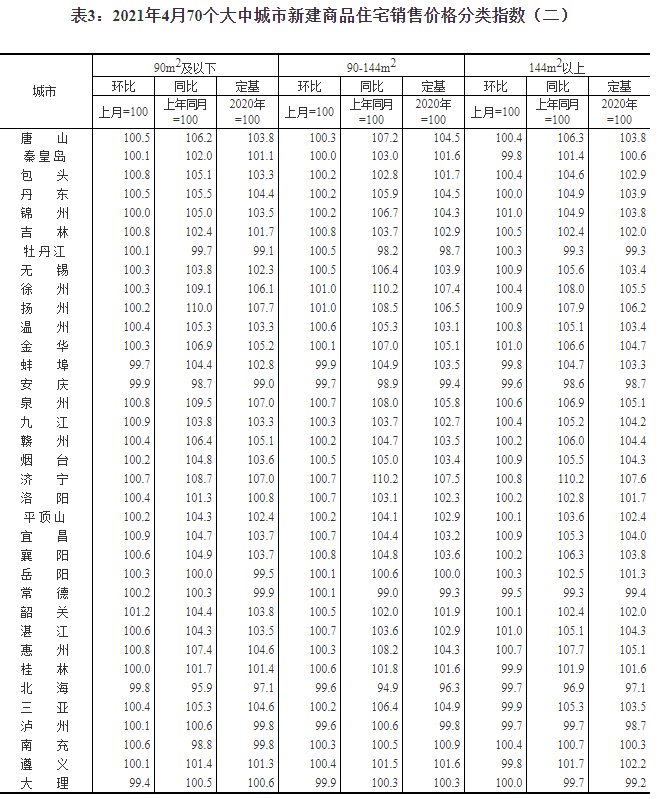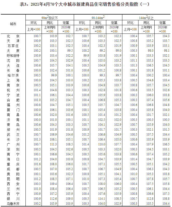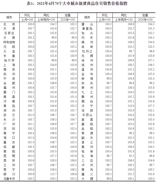 2021年4月份70個大中城市商品住宅銷售價格變動情況